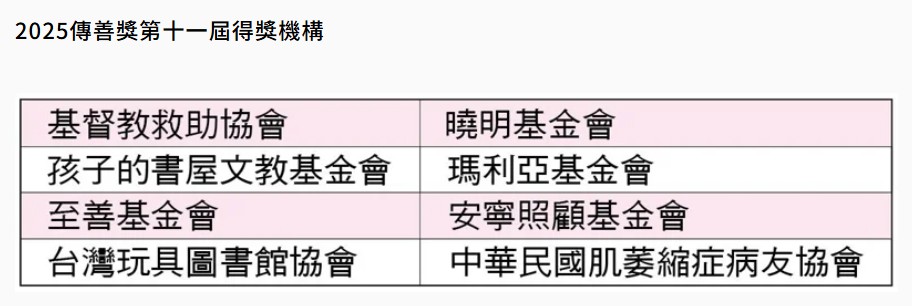 第十一屆傳善獎由「基督教救助協會」、「孩子的書屋文教基金會」、「至善基金會」、「台灣玩具圖書館」、「曉明基金會」、「瑪利亞基金會」、「安寧照顧基金會」、「中華民國肌萎縮症病友協會」等8家機構獲獎,涵蓋兒少陪伴、偏鄉教育、身心障礙支持、安寧照護、病友服務以及惜食議題、循環經濟、組織數位轉型等多元領域,提供每家每年500萬、連續3年共1.2億元的穩定挹注,讓機構創新、成長、茁壯,為社會織起堅韌安全網絡。也期待企業認識更多優質得獎機構,攜手合作企業ESG,為社會帶來更多善的循環。