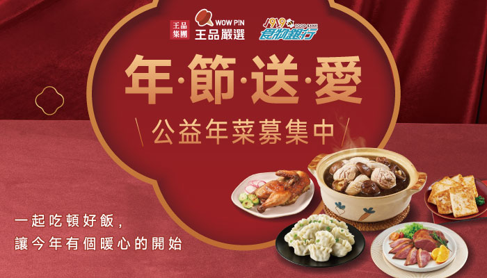 王品集團顧念弱勢家庭的需要,攜手「 1919 食物銀行」 發起「公益年菜認購計畫」,邀請愛心大眾一人認購一套年菜組(王品嚴選益起團圓宴),讓愛心化作一道道熱騰騰的佳餚,陪伴弱勢家庭,在除夕夜也能團圓圍爐、安心過年。