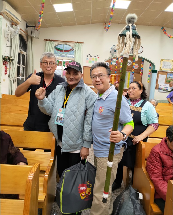 年輕時開貨車、後來經營葬儀社的陳阿公樂觀地說:「以前我開葬儀社時幫助過很多人,或許是好心有好報,所以即使眼睛看不清楚,又得過肝癌,但還是活了下來。」志工們得知他視力不佳,紛紛主動攙扶、陪伴左右。相信他雖然看不見志工的臉,卻一定能感受到大家的心意。