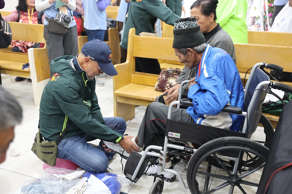63 歲的謝大哥,原本務農,因跌倒手術失敗傷及脊椎,從此只能坐在輪椅上。今天他難得出門,幸福巴士隊長彭民雄親自為他試穿新衣新鞋,並始終陪伴在旁,讓他度過一個溫馨又溫暖的聖誕節。
