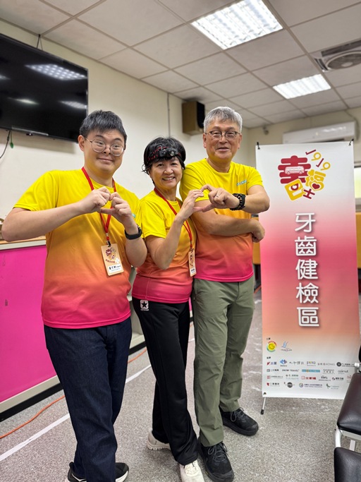 今天的行動牙診特別溫馨。來自台北陽光牙醫診所的黃明裕醫師,從北部一路義診到屏東。昨晚,太太陳南瑤牙醫師與兒子黃于軒也特地南下,加入今明兩天的服務行列。甚至他們診所的牙齒矯正患者——就讀屏科大的陳柏瑄,也主動投入志工服務,成為貼心的小幫手。