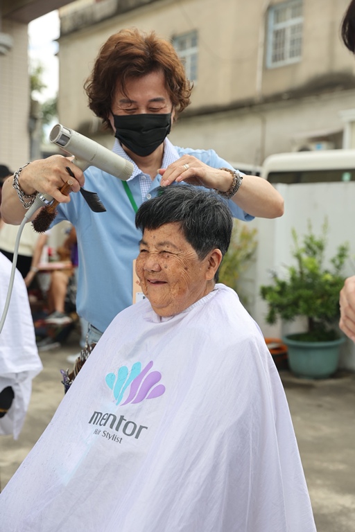 設計師林逸耘多年參與義剪,看著阿嬤,更加確定自己為何而來──因為這樣的陪伴,真的能成為他人的力量。只見她放慢動作,一刀一剪,細心為阿嬤修整頭髮。起初,阿嬤只是靜靜坐著,神情拘謹;直到整理完成,抬頭望見鏡中的自己,臉部線條也跟著柔和了下來。