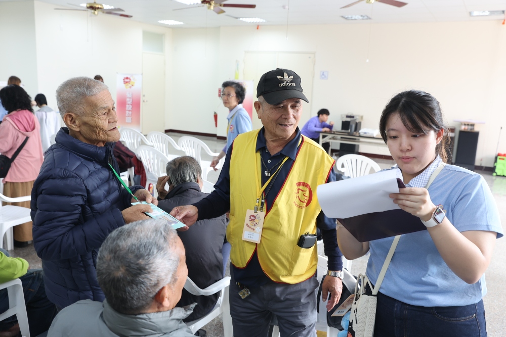 今天到場的長輩多半是熟面孔,但也有特地從台中太平搭公車前來的。現場忙碌卻不慌亂,志工們逐一陪伴長輩確認需求、引導動線。身穿紫色背心的,是平日在關懷據點服務的志工,他們對長輩的狀況再熟悉不過——知道誰需要多一點攙扶,誰需要慢慢解釋。