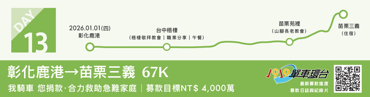 這份盼望,回應著跨越百年的呼聲。1875年,馬偕博士將盼望化為行動,感動基隆廟口的和尚;4年後,英國籍的李庥牧師也在歲首時於北港朝天宮前,將盼望帶進上千個家庭。站在歷史與信念交會的起點,勇士們互勉:2026的首航,將從鹿草路轉入西濱公路,隨著踏板的轉動,把盼望一路撒向沿岸,翻轉生命的風景。