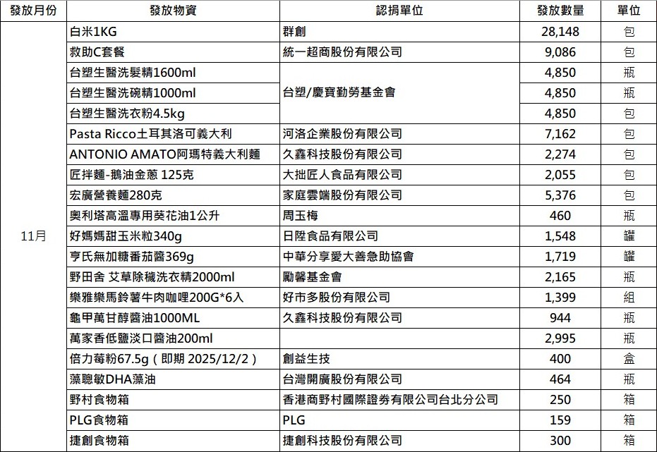 歡迎個人或企業直接捐贈物資,可採「不定期不定量」、「定期不定量」或「定期定量」的方式捐贈以下物資 (恕不接受二手衣物):