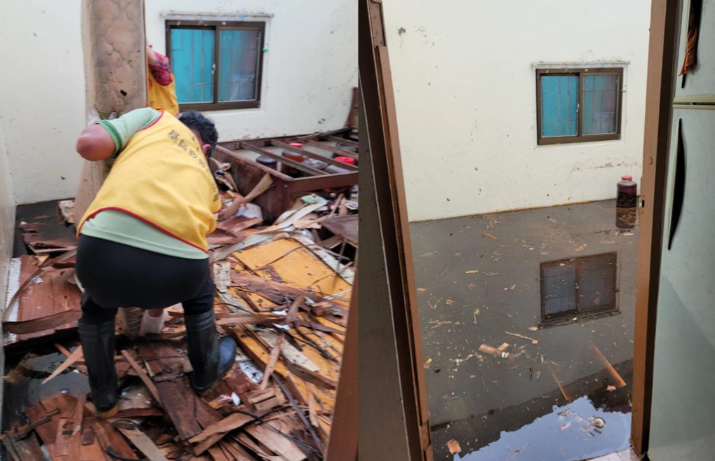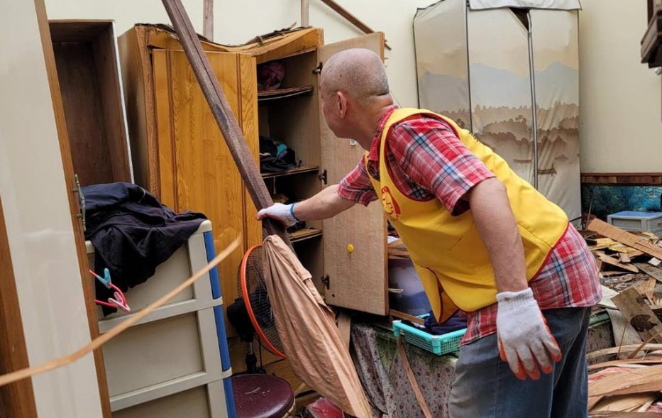 救助協會20日動員35位志工前往長沙里,協助獨居長者清理環境、搬運傢俱,志工們走進尚未完全退水的屋內,清除泡水傢俱與衣物,並同步評估後續修繕需求,災情最為嚴重的一戶整間屋頂被掀、傢俱全毀,室內積水仍深及腳踝。