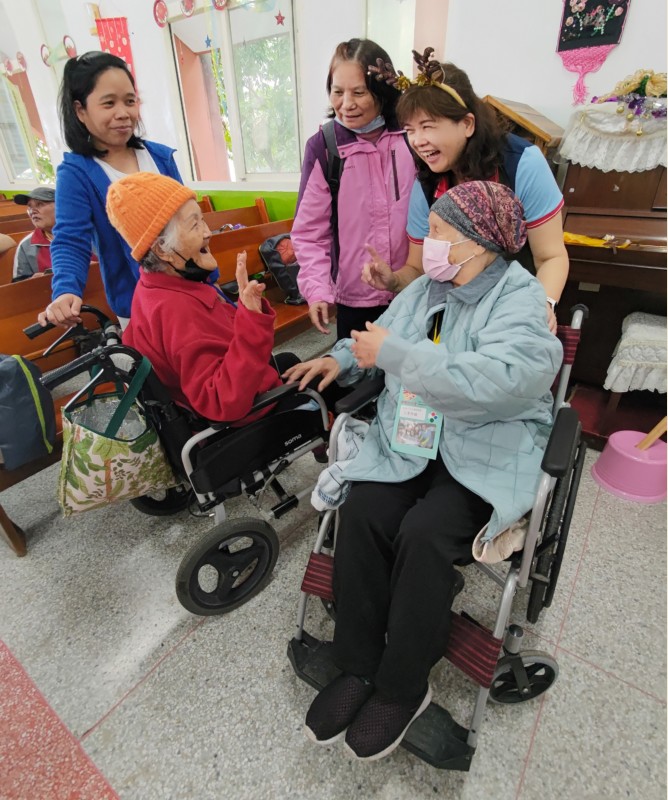 年輕時開貨車、後來經營葬儀社的陳阿公樂觀地說:「以前我開葬儀社時幫助過很多人,或許是好心有好報,所以即使眼睛看不清楚,又得過肝癌,但還是活了下來。」志工們得知他視力不佳,紛紛主動攙扶、陪伴左右。相信他雖然看不見志工的臉,卻一定能感受到大家的心意。