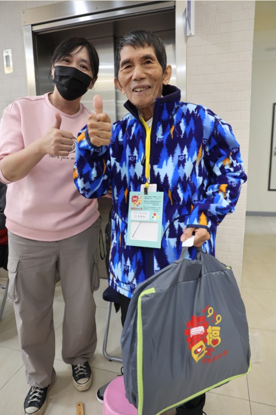 80歲的阿祥阿公,年事已高,卻仍一肩扛起照顧腦性麻痺女兒與中風太太的責任。今天,在志工陪伴下,他換上可雙面穿的保暖外套。亮麗的花色讓他整個人都精神起來,臉上也浮現久違的笑容。
