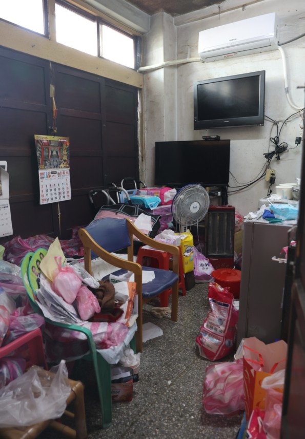 阿嬤的房間只有2、3坪,堆滿雜物,也許是早已沒有體力整理。她從小在這裡長大,與父母一同在樓下做生意。婚後搬離30多年,育有3名子女,其中一位已過世,其餘一子一女偶爾會寄錢回來。