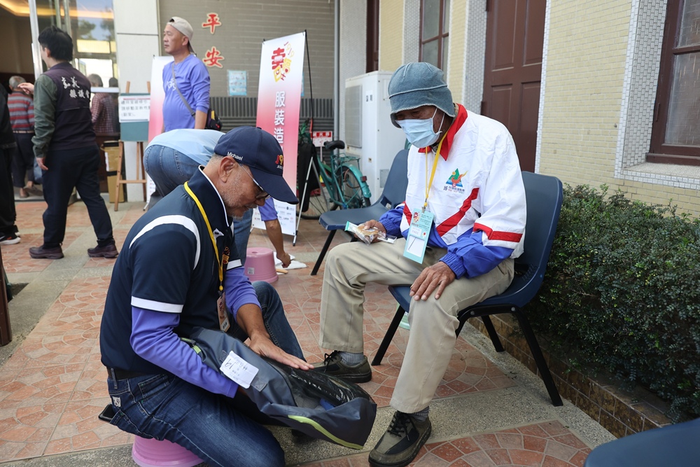 這一站,也出現了一段久別重逢。幸福巴士隊長彭民雄,親自為一位曾在旅行者台北辦公室大樓擔任保全、如今成為受助者的阿彬大哥(化名)整理衣著。他彎著腰替阿彬試穿鞋子,輕聲詢問是否合腳。那不是制式的服務,而是多年情誼延續出的自然關懷。