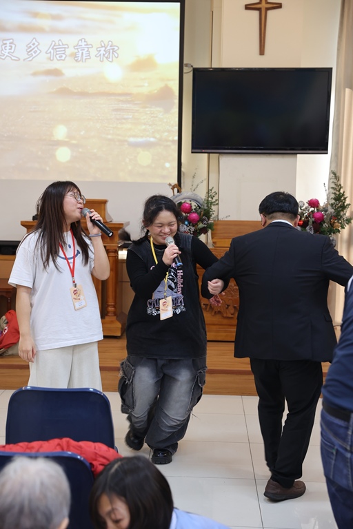 午後現場還有兩位亮眼的年輕志工——洪約瑟牧師的女兒,趁著寒假投入服務,是今年行程中少數的青春面孔。她們不只協助長輩,也與父親一同上台表演,帶動現場氣氛。音樂與笑聲交織,原本略顯拘謹的長輩們也跟著拍手,整個會場充滿活力。