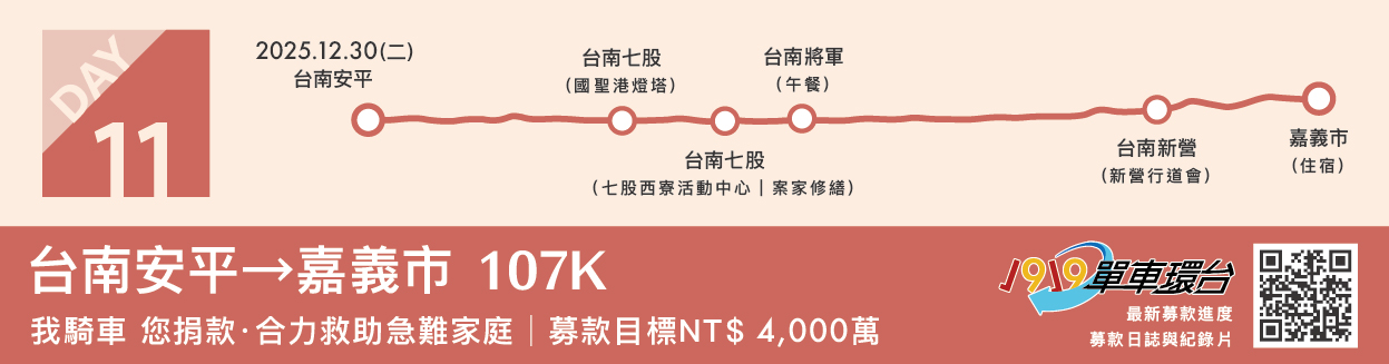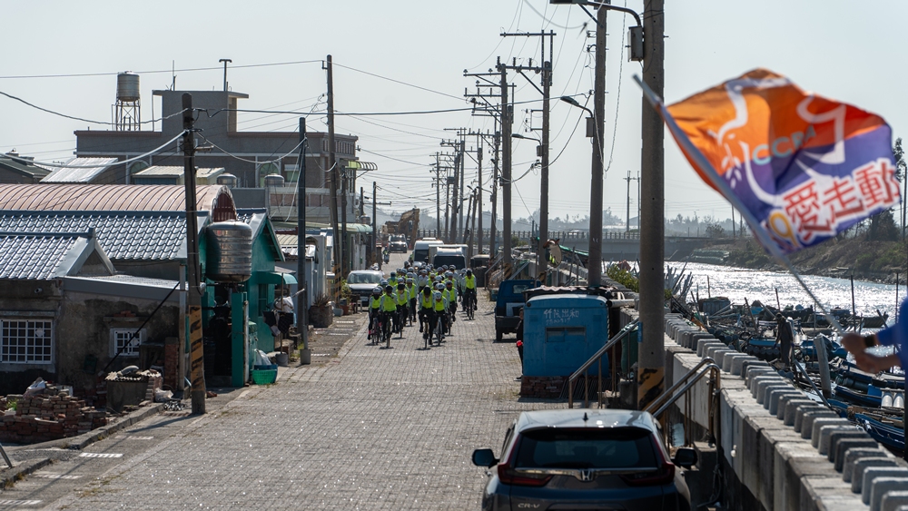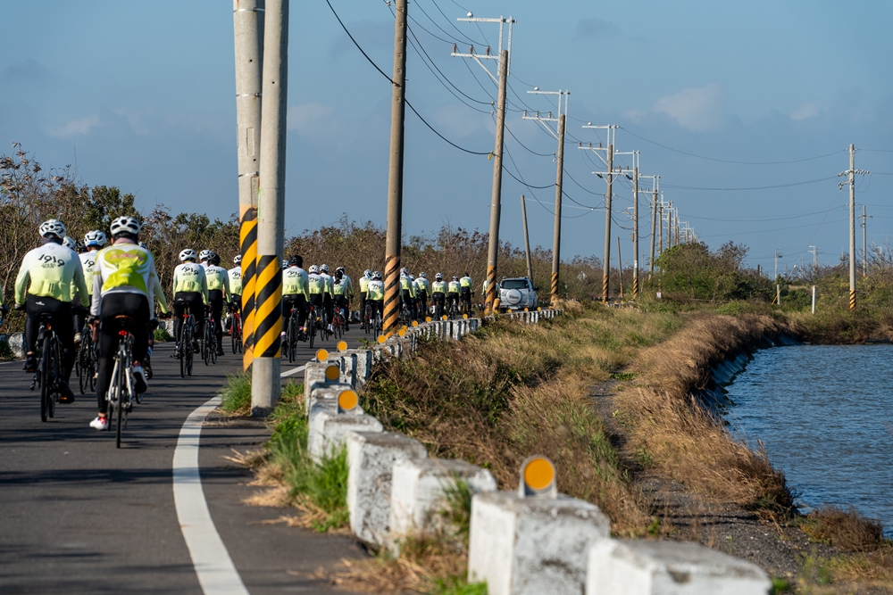 今天行程格外緊湊,不僅規劃騎乘107公里,還橫跨12個鄉鎮市區,加上探訪行程密集,車隊因此比平日提早半小時出發。所幸清晨的安平天氣晴朗,溫暖的陽光與強勁的海風相伴,讓一早上路的勇士們個個精神抖擻。