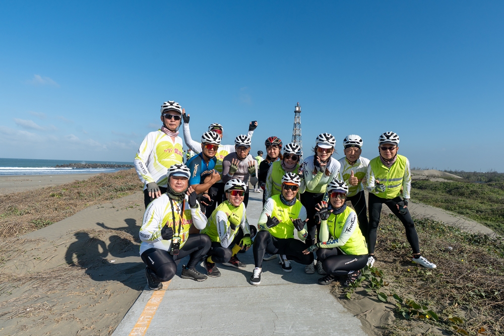 除了 Mauro,車隊後方還加入了多位陪騎勇士,一路陪伴至燈塔。他們都來自全興公司單車社,包括前幾天接力的總經理李英桐、陳麗靜、王郁晴,以及剛接棒的方言豪等共11人。眾人在燈塔前合影留念,短暫陪伴這座孤獨的地標後,便再度踏上旅程。