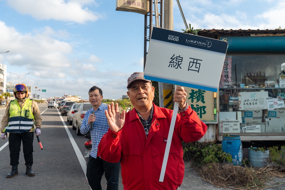 「新年快樂!1919加油!」台17線上線西1919服務中心(線西靈糧之家)對面路旁,湯文清牧師與蕭雲鳳師母正帶著孩子與家長們高舉紅布條與手繪看板,為車隊加油。這一聲聲祝福,讓原本因逆風而沉重的踏板,不再只是體力的對抗,而成為向前突破的力量。