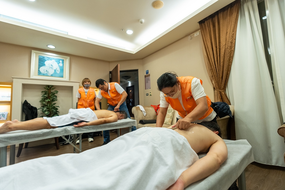 而迎接勇士的,是今年行程中最溫暖的驚喜——專業運動按摩。交誼廳裡,「樂齡17」的師傅們早已就位,以專業手法為疲憊的身體釋放張力。這份即時的支持,來自陪騎勇士周冠閎——他將無法全程參與的遺憾,轉化為帶領專業團隊為勇士續航的行動。即便只能接力參與首尾,仍以職人的雙手,為這場愛的長征注入最實在的力量。